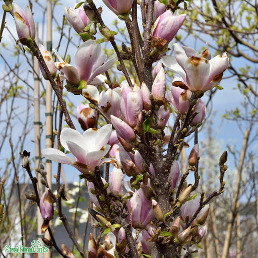 Magnolia 'Satisfaction' Info: Flerstammig, tät magnolia med underbara, doftande blommor med rosa utsida och vit insida. Blommar under bladspricknin...