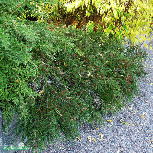 View full detailsLingonoxbär Info: Utbrett växtsätt, fiskbensmönstrat grenverk. Små mörkgröna blad. Vita blommor i juni, små röda frukter. Orangeröd höstfärg. Anspr...