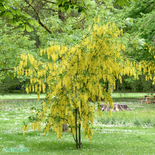 Hybridgullregn 'Vossii' Info: Stor buske eller mindre träd med upprätt och vasformigt lätt överhängande växtsätt. Gula blommor i långa klasar i maj...