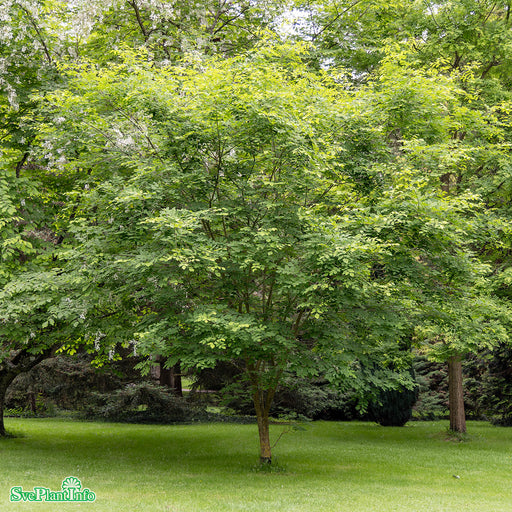 Gulved Info: Medelstort träd med exotiskt utseende. Får en bred uppsplittrad krona. Bladen bryter sent på säsongen i frostiga toner för att sedan ö...