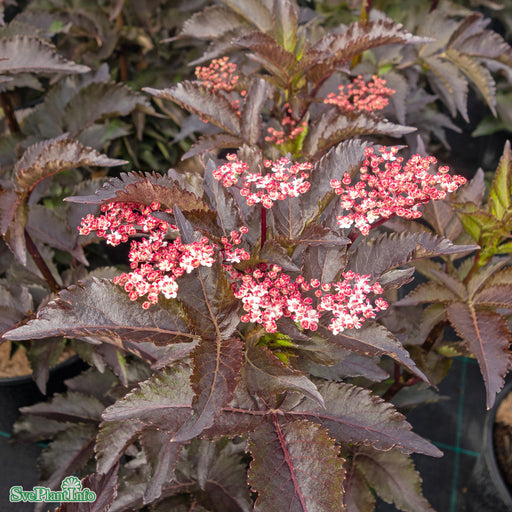 Fläder Black Lace ('Eva'*) Info: Kallas även för blodfläder. Fläder med ett exotiskt utseende, fint flikiga mörkröda blad. Ljusrosa små blommor i e...
