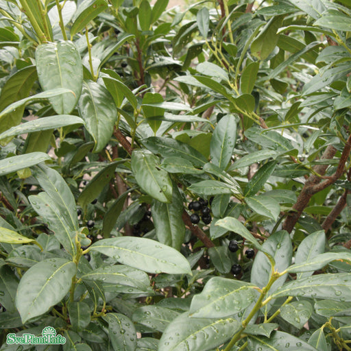 View full detailsLagerhägg 'Mano' Info: Lågväxande, vintergrön buske med mörkgröna blad. Blommar med vita blomklasar i maj-juni som ger svarta bär till hösten. Behö...