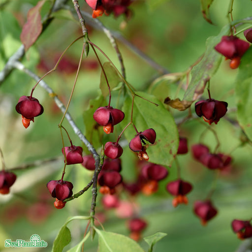 Körsbärsbenved Info: Buske med vasformigt, upprätt växtsätt. Stora spetsiga knoppar, dekorativa rosa-orange frukter på hösten. Höstfärger i ljusgul...