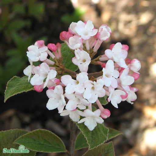Hybridolvon Info: Buske med glest upprätt växtsätt. Doftande rosa-vita blommor i runda blomställningar i april-maj. Vacker mörkgrönt glänsande blad...