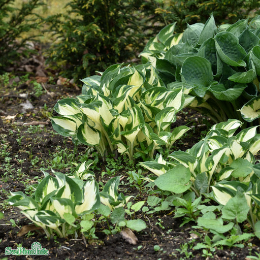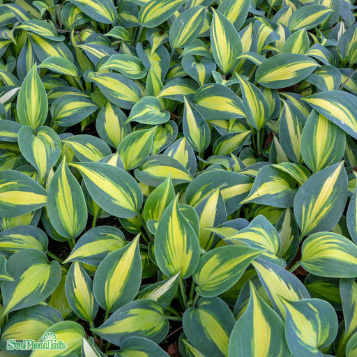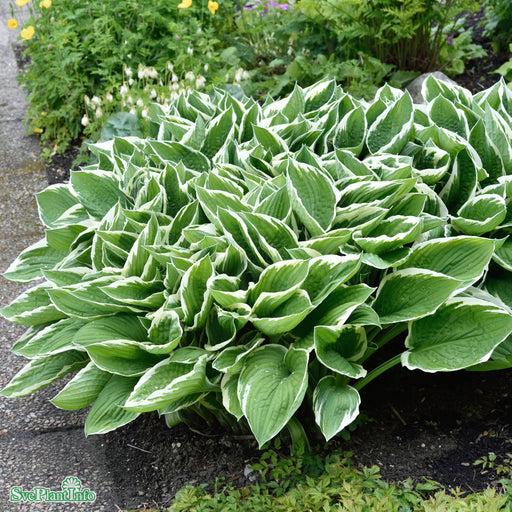View full detailsFunkia 'Wide Brim' Info: Tuvbildande perenn. Gröna blad med bred gul kant. Blommar med ljusvioletta blommor på 50 cm höga stänglar i juli-augusti. ...