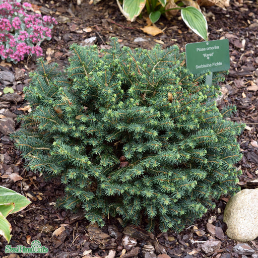 Dvärggran 'Karel' Info: Liten dekorativ gran med tätt kompakt och utbrett växtsätt. Växer mycket långsamt. Mörkgröna barr med vit undersida, nya sk...