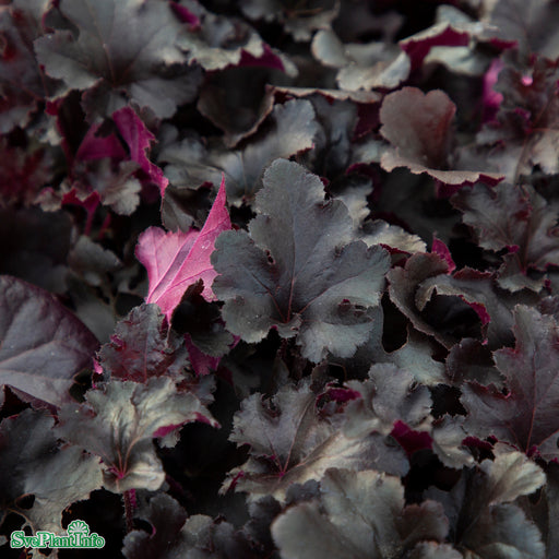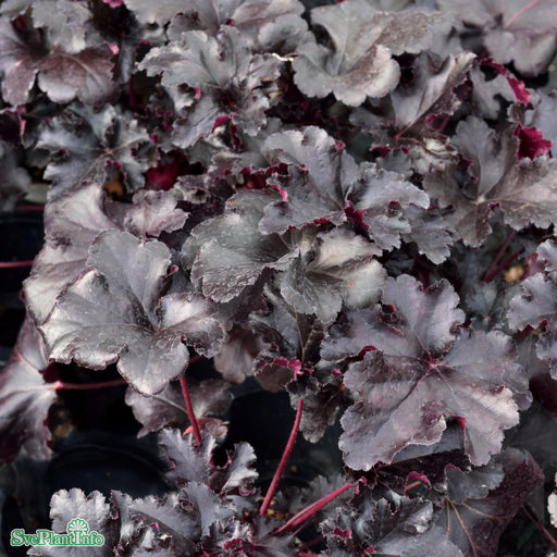 Alunrot 'Black Pearl' Info: Tuvbildande perenn med svarta blanka blad med rosaviolett undersida. Små klocklika vita blommor på höga stänglar i juni...