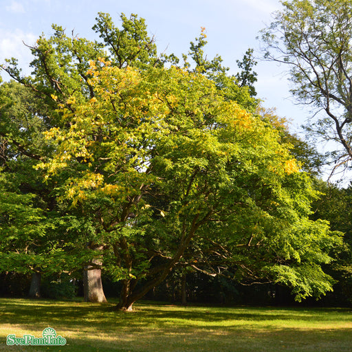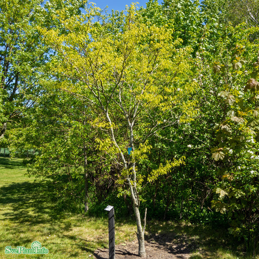View full detailsGulved Info: Medelstort träd med exotiskt utseende. Får en bred uppsplittrad krona. Bladen bryter sent på säsongen i frostiga toner för att sedan ö...
