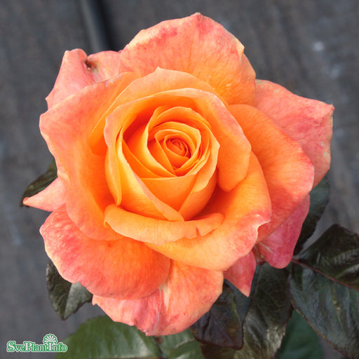 Tehybridros Troika® ('Poultroi') Info: Kraftigt tätt växtsätt. Frodigt mörkgrönt starkt glänsande bladverk. Medelstora, fyllda brons till orangegul...