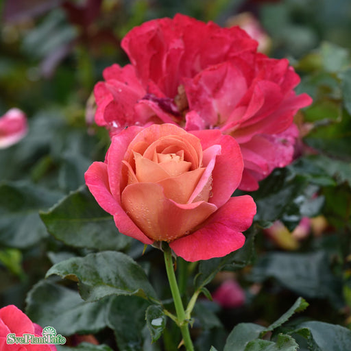 Tehybridros Flora Danica ('Poulrim') Info: Tätt upprätt växtsätt och gråaktigt grönt glänsande bladverk. Tätt fyllda orange- persikofärgade blommor...