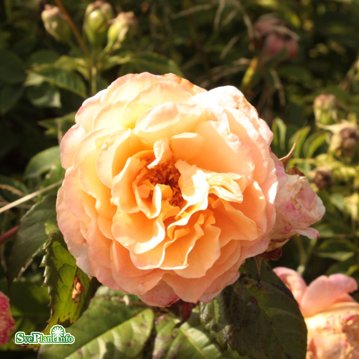 Tehybridros 'Augusta Luise' Info: Kompakt växtsätt och mörkgrönt bladverk. Stora fyllda aprikosfärgade blommor med inslag av röda till gula nyanser...
