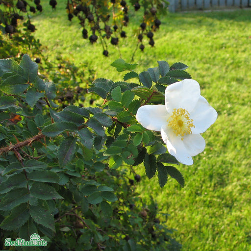 Vresros 'Alba' Info: Kraftigväxande och tålig ros. Vackra enkla stora vita blommor. Stora röda runda nypon på hösten Mycket taggig och gillas därfö...
