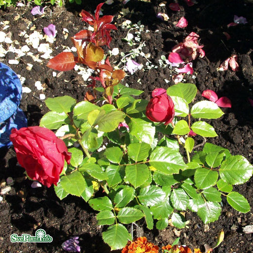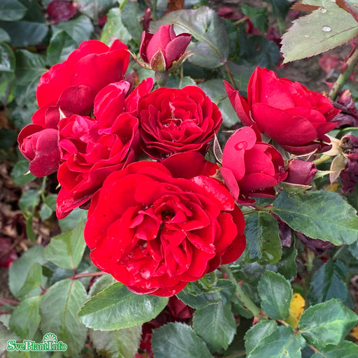 Floribundaros Lavaglut ('Korlech') Info: Klasblommig rabattros med upprätt växtsätt. Medelstora halvfyllda mörkt röda blommor. Svag fin doft. Blomm...