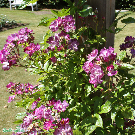 View full detailsMultiflora-Ros 'Veilchenblau' Info: Vacker klätterros med kraftigt och tätt växtsätt. Nästan taggfri. Blommar med purpurvioletta blommor med citron...