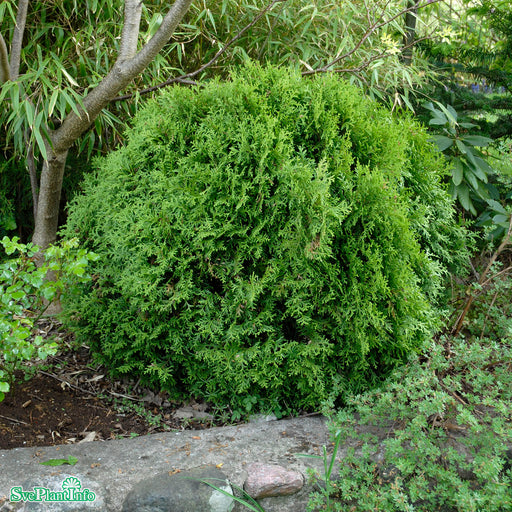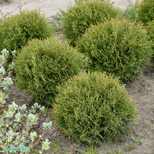 Tuja 'Tiny Tim' Info: Liten klotformad tuja. Har grövre barr än 'Danica'. Mycket användbar i rabatter och samplaneteringar. Fungerar också bra i kr...