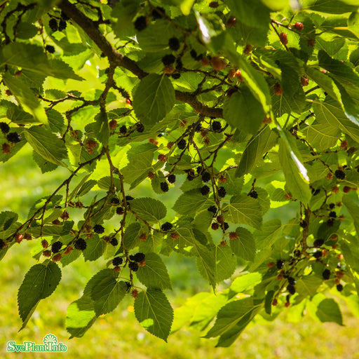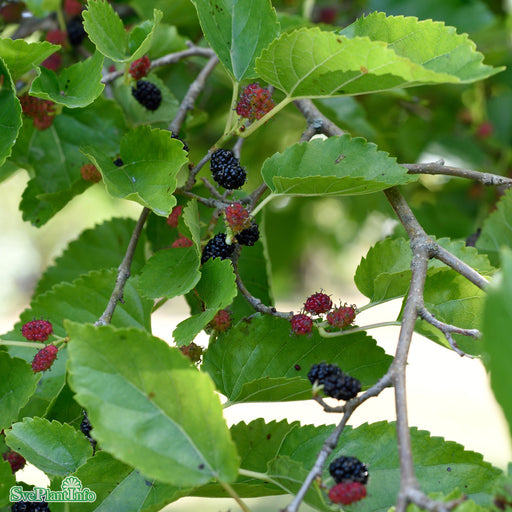 Svart Mullbär 'Mulle' E Info: Medelkraftigt brett växtsätt. Svarta söta aromatiska bär, kraftigt färgande. Lång mognadsperiod juli-sept. Utmärkt at...